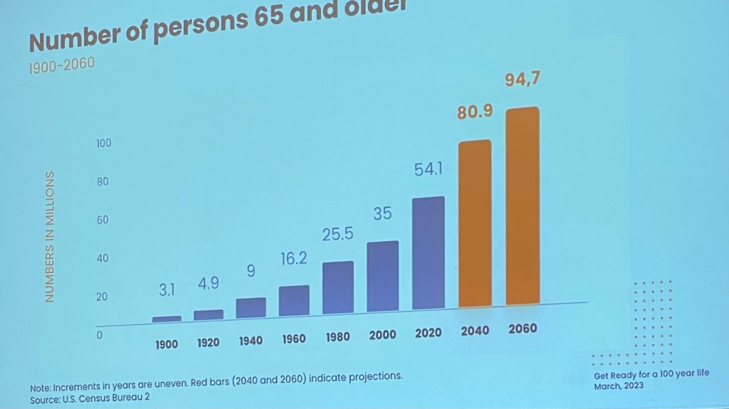 Nu zijn er in de VS ongeveer 35 miljoen mensen van 65 of ouder, in 2060 zijn dat er bijna 95 miljoen.